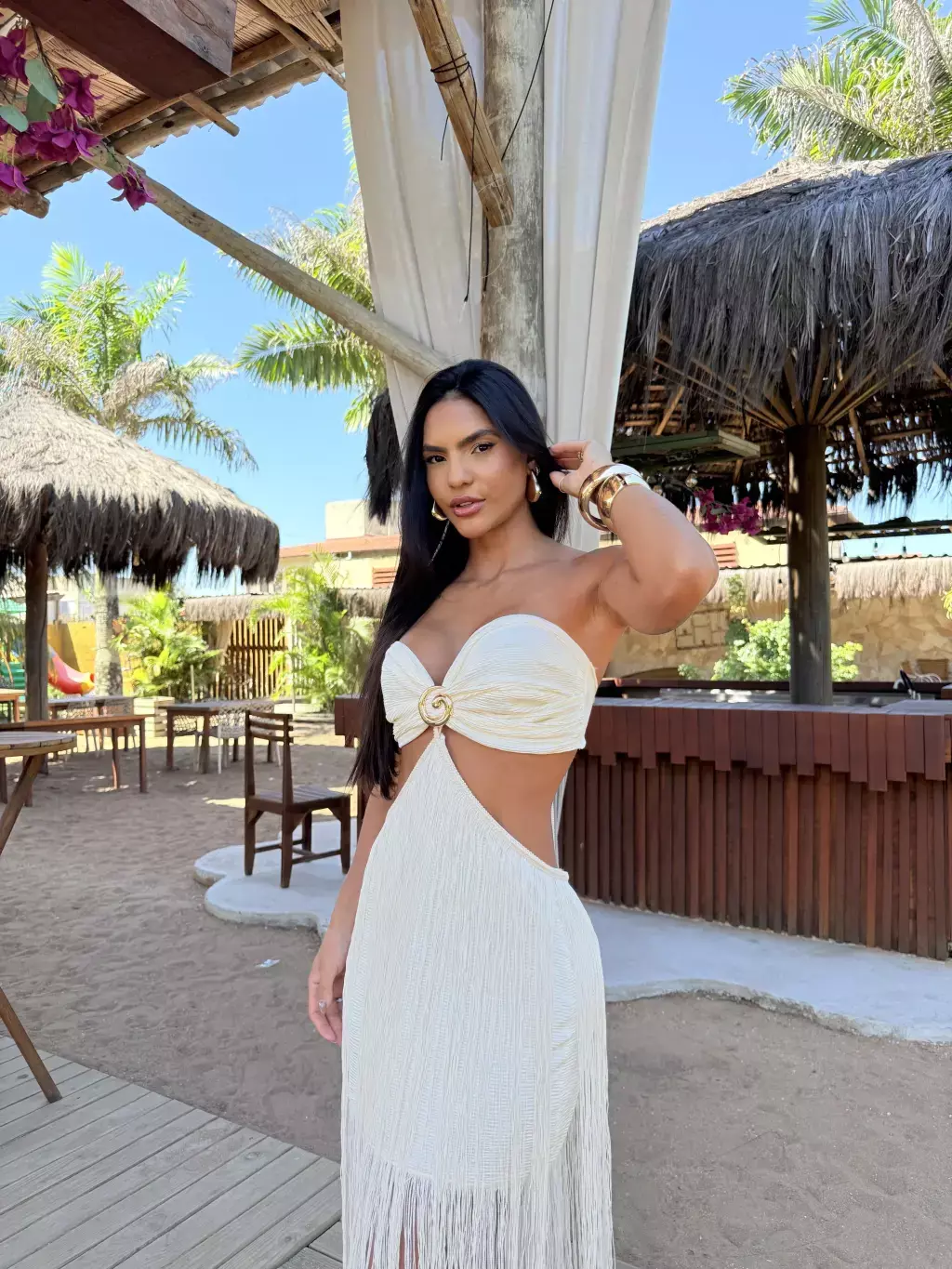 Vestido confeccionado em malha rilievo, modelo tomara que caia, possui pregas nas laterais do busto, aplicação de aviamento dourado no centro do decote, recorte estrategico na cintura, aplicação de trança no recorte da cintura, franjas sobreposta, longas, costas com elástico e fechamento posterior por zíper.