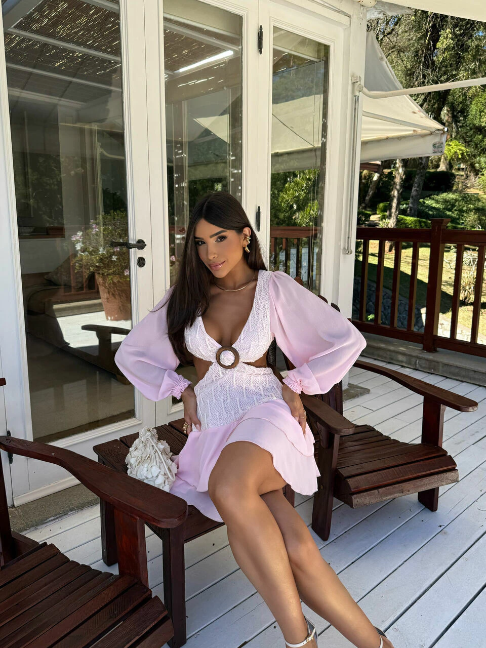 Vestido confeccionado em um composê de chiffon tecturizado passione e malha tricô, possui decote V profundo, mangas longas, punhos ajustados por elástico, recortes estrategicos na cintura, costas com elástico, saia com babados sobrepostos, comprimento curto, shape fluido e fechamento lateral por zíper.